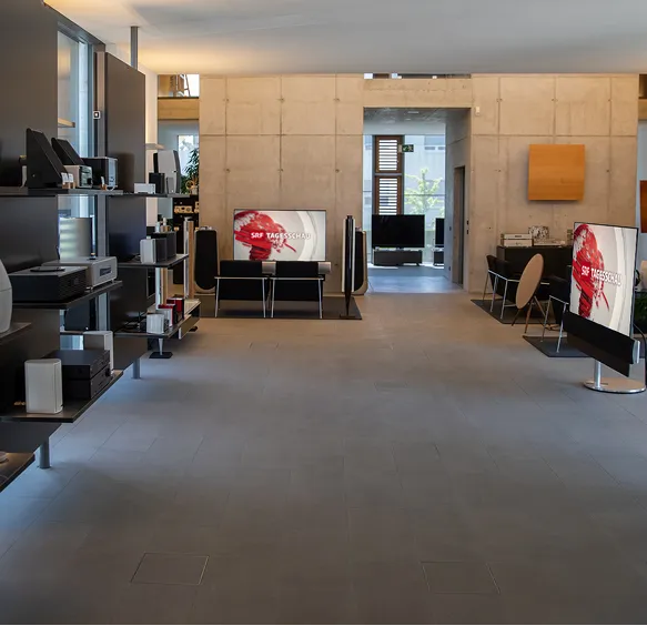 Für einen Wohnungsneubau durfte das Audio- und Videokonzept geplant und umgesetzt werden. Ein Beovision Harmony 77" mit zwei Beolab 18 Lautsprecher und einem Beolab 19 Subwoofer sorgen im Wohnzimmer für ein atemberaubendes Fernseh- und Musikvergnügen. Bereits bei der Planung wurde gemeinsam die Positionierung der Produkte geplant, damit alle Zusatzgeräte und die Kabel unsichtbar platziert und verlegt werden konnten. Das Aluminium und Holz der Bang & Olufsen Gerätschaften harmonieren perfekt mit der schönen Sichtbetonwand. Im Essbereich, Schlafzimmer, Badezimmer und den weiteren Räumlichkeiten wurden hochwertige Lautsprecher in die Betondecke eingelassen und in der Sauna wurde ein wasserdichter Lautsprecher installiert. Auf Knopfdruck bei der Wandbedienung oder mittels der Bang & Olufsen App kann jeder Raum komfortabel gestartet werden.