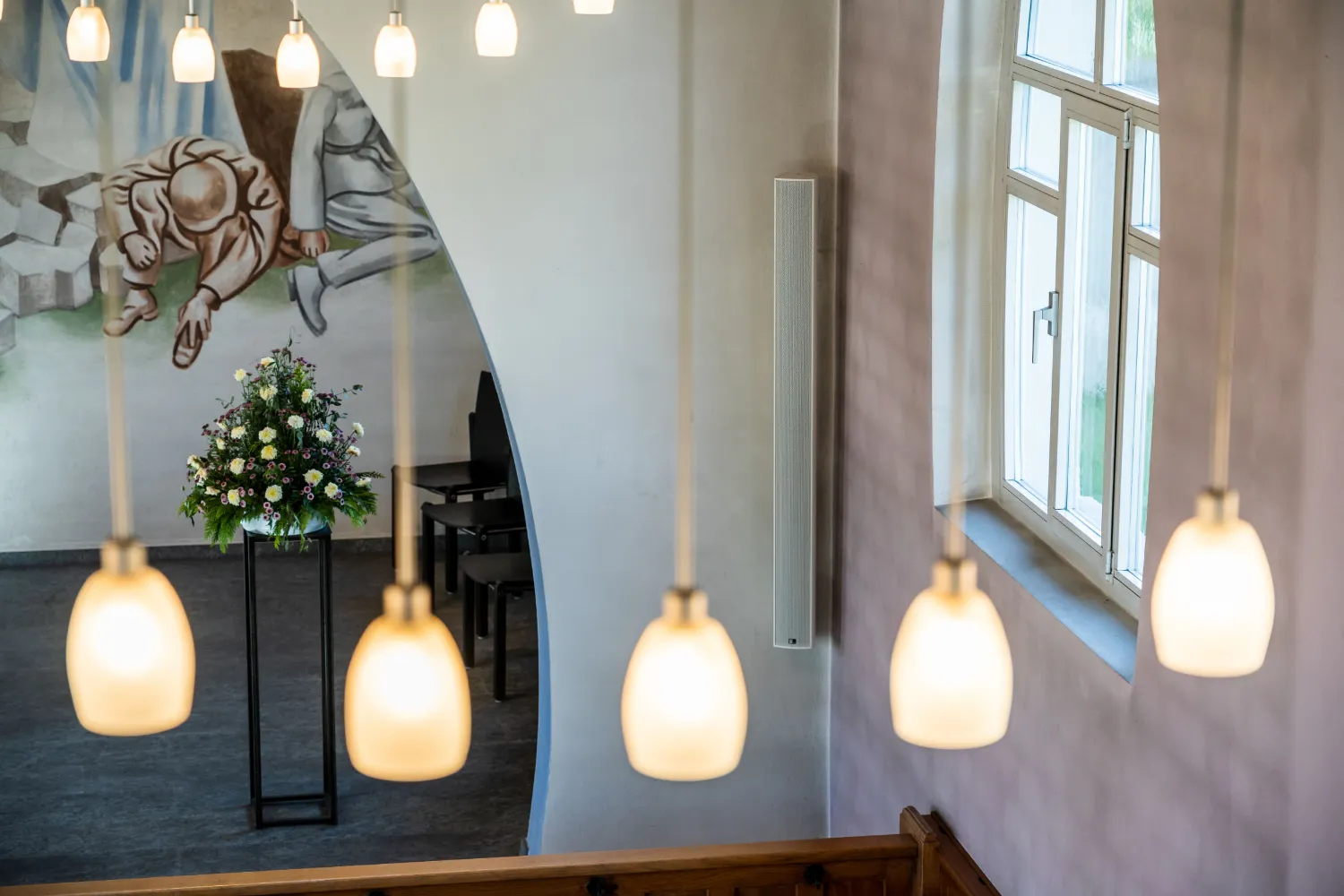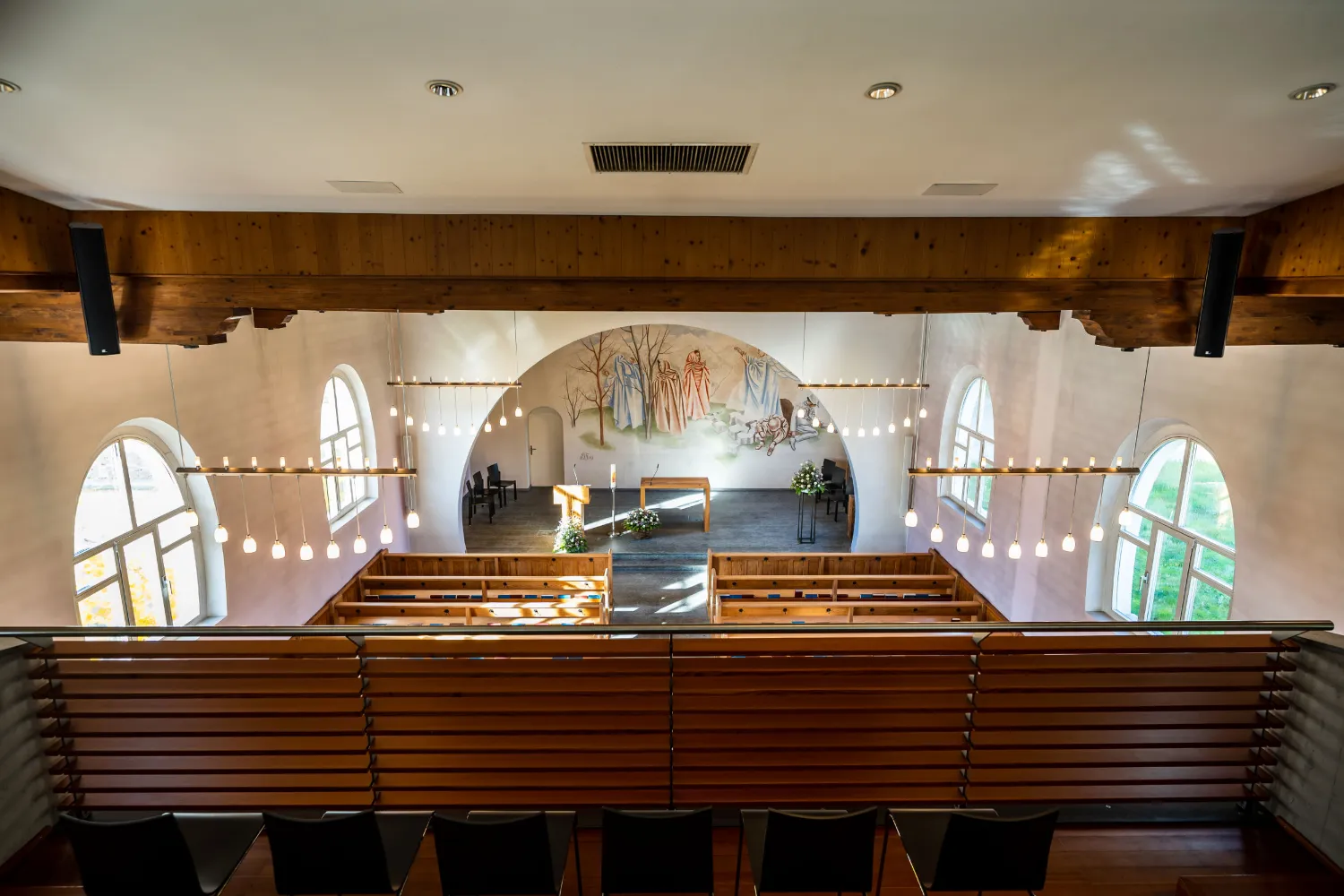 Die Kapelle des Stadtfriedhofes in Wil wurde mit einer neuen Mikrofon-, Audio- und Lautsprecheranlage ausgestattet. Elegante Säulenlautsprecher des deutschen Herstellers Fohhn sorgen für eine klare Sprachverständlichkeit und einen hervorragenden Klang in der gesamten Kapelle. Das Abspielen eigener Musikstücke ist per Bluetooth, CD oder USB für Angehörige auf Tastendruck möglich. Dank einer 3-D Planung und Simulation wurde das optimale Lautsprecherkonzept für die Kapelle und den Aussenbereich geplant und umgesetzt. Für Hörbeinträchtige wurde ein neuer Induktionsverstärker installiert, damit das gesprochene Wort direkt über das eigene Hörgerät wiedergegeben wird.
