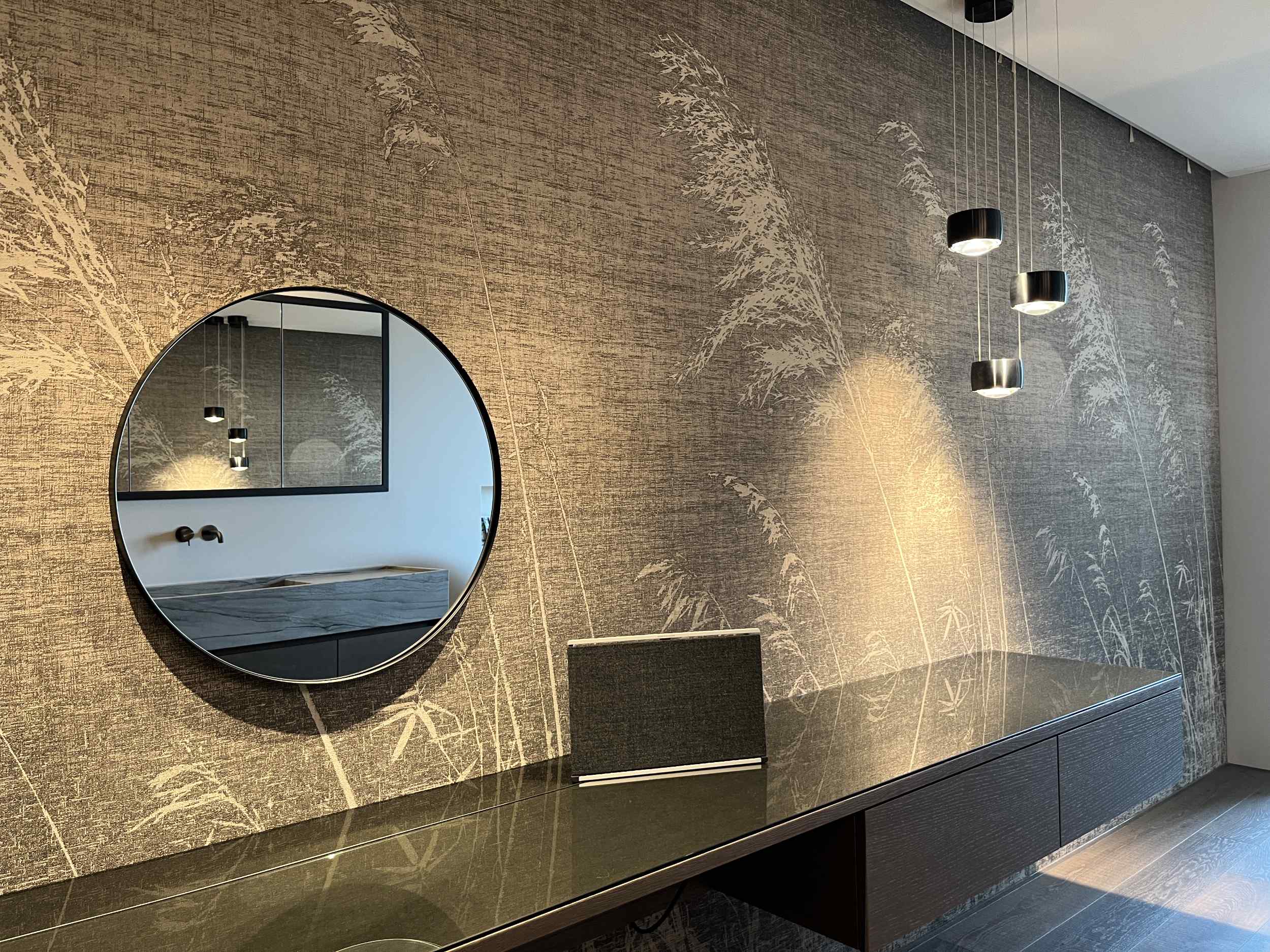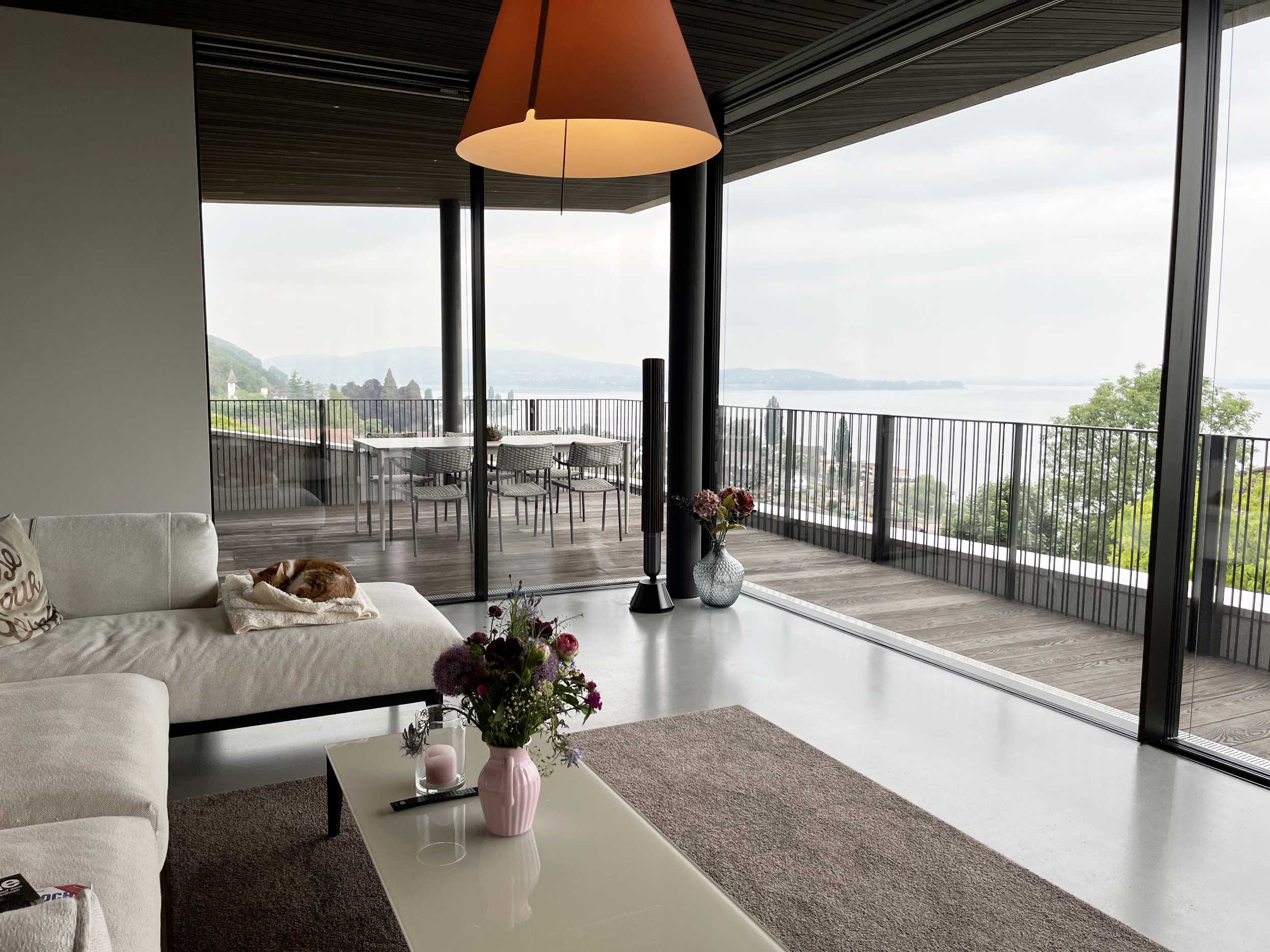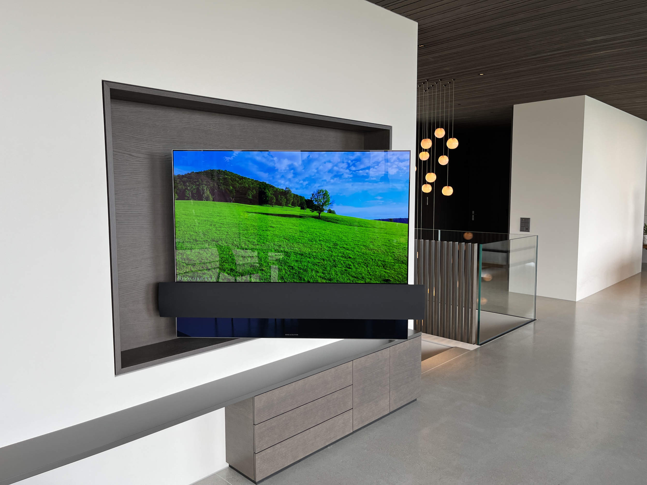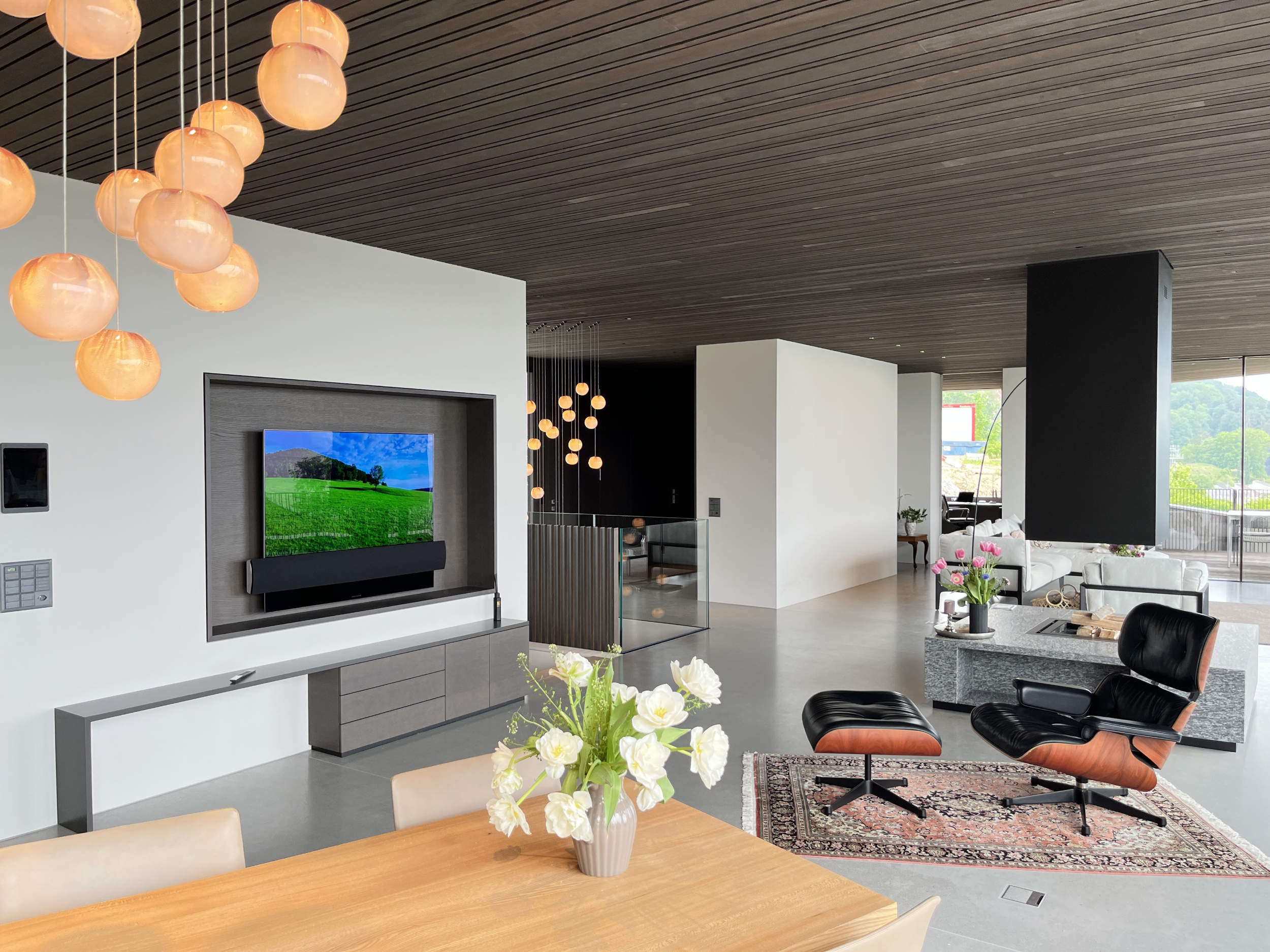 Bei einem Wohnungsumbau durfte das komplette Audio- und Videosystem erneuert und erweitert werden. Als Fernsehlösungen für die unterschiedlichen Zimmer wurde der deutsche Hersteller Metz gewählt. Im Wohn- und Essbereich sorgen die zwei Beolab 18 Lautsprecher von Bang & Olufsen für einen erstklassigen Musikgenuss. Auf der Terrasse, in der Bibliothek und in den Nasszellen wird auf Knopfdruck die Musik abgespielt. Im Badezimmer und Gäste-WC wurden unsichtbare Unterputz-Lautsprecher eingebaut. Wird das Licht im Gäste-WC eingeschaltet, erklingt automatisch Hintergrundmusik.