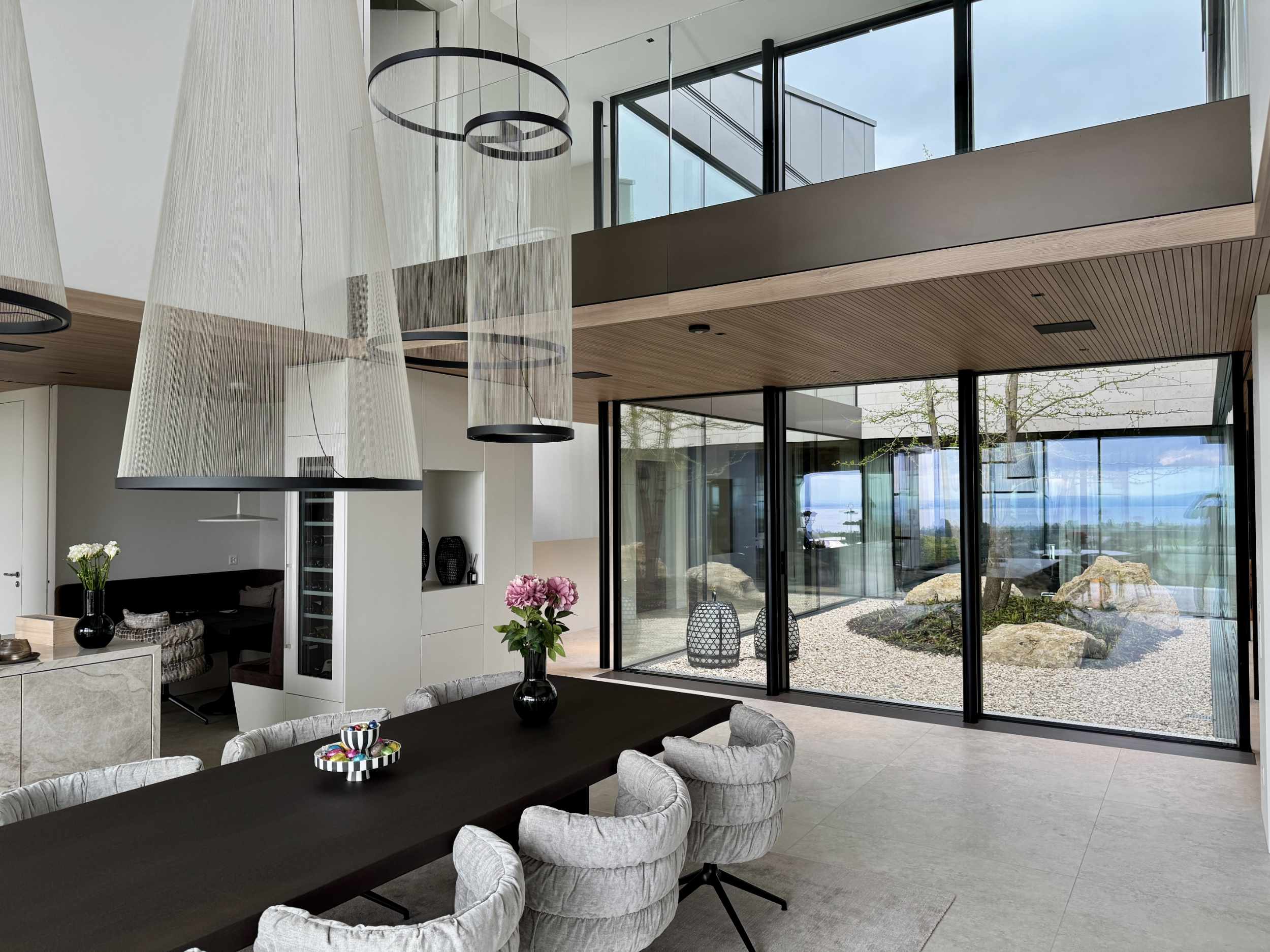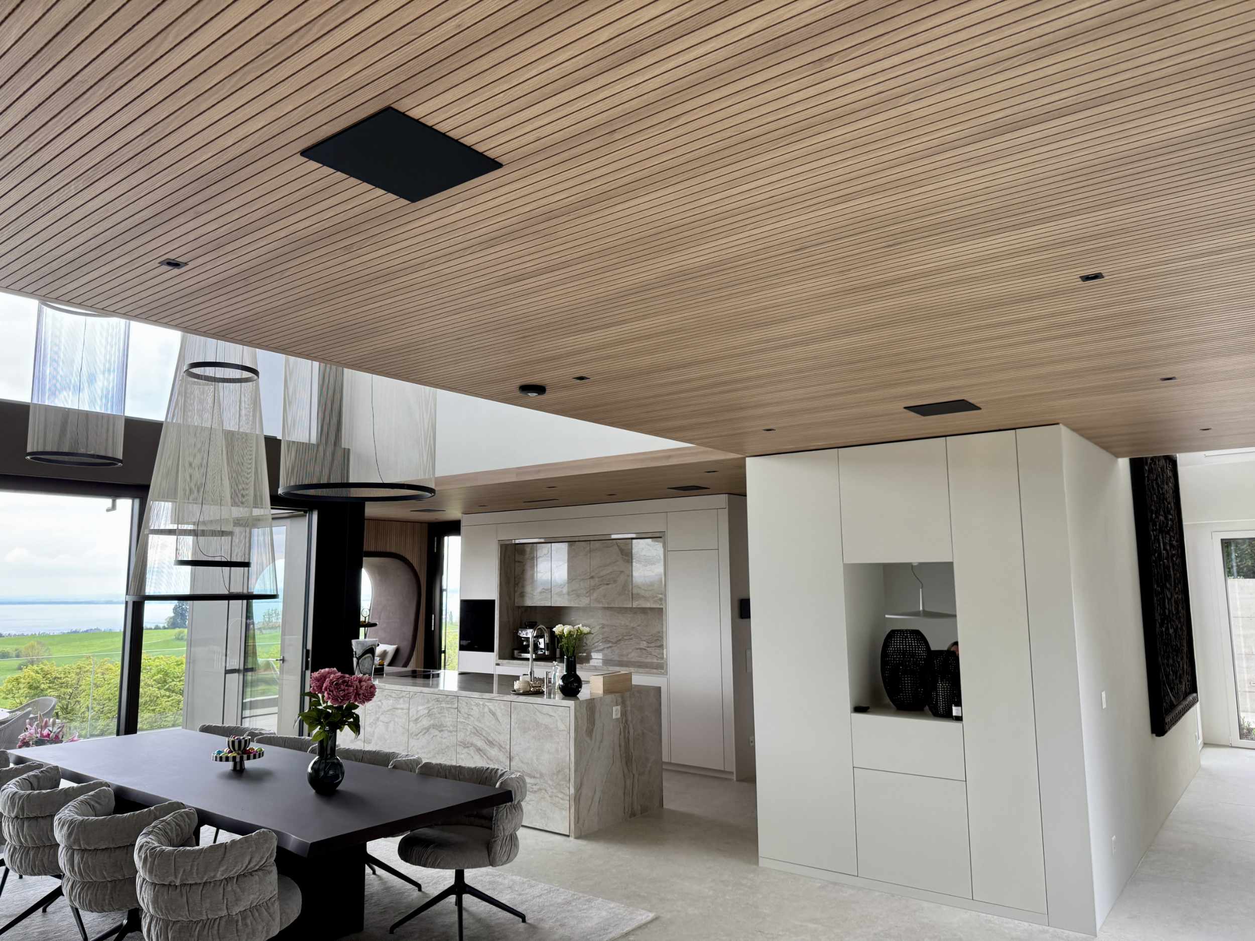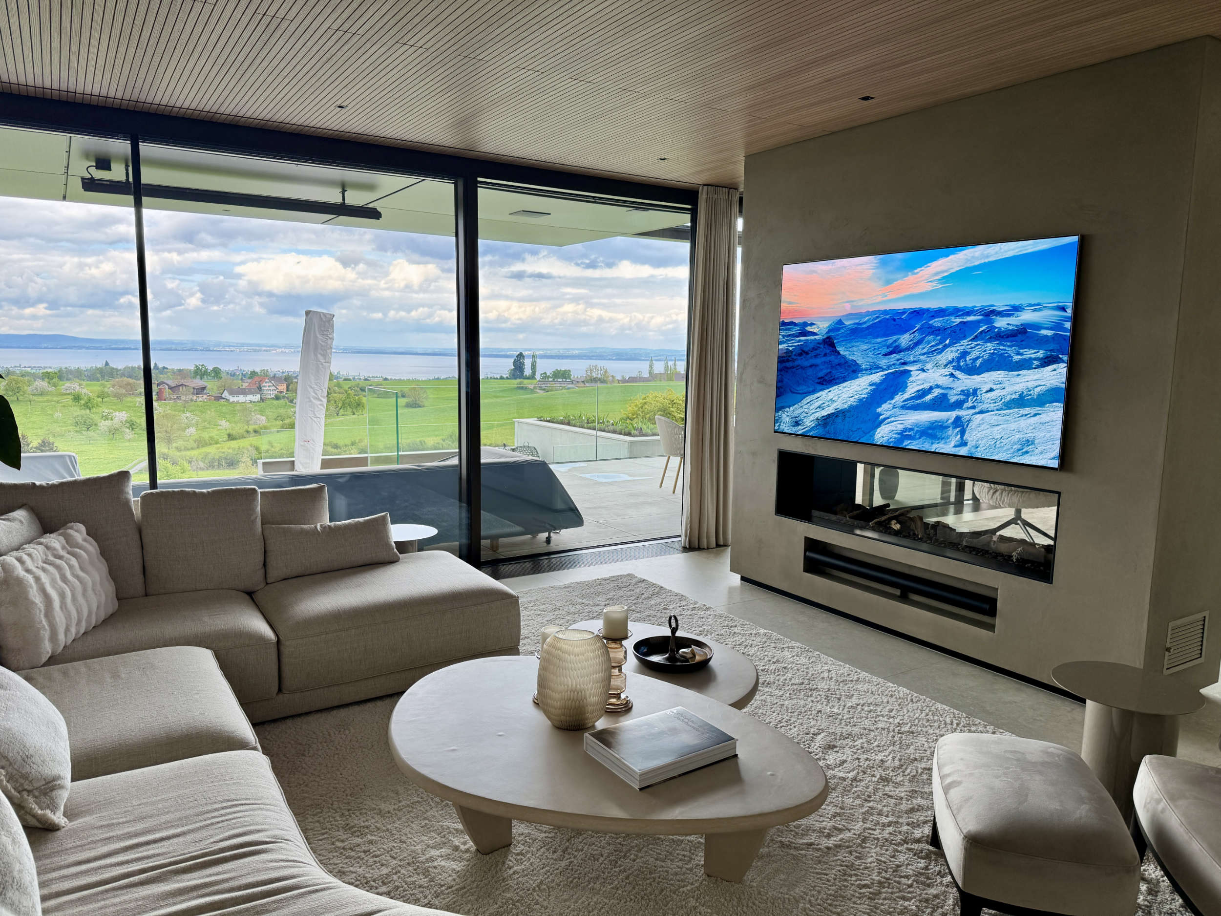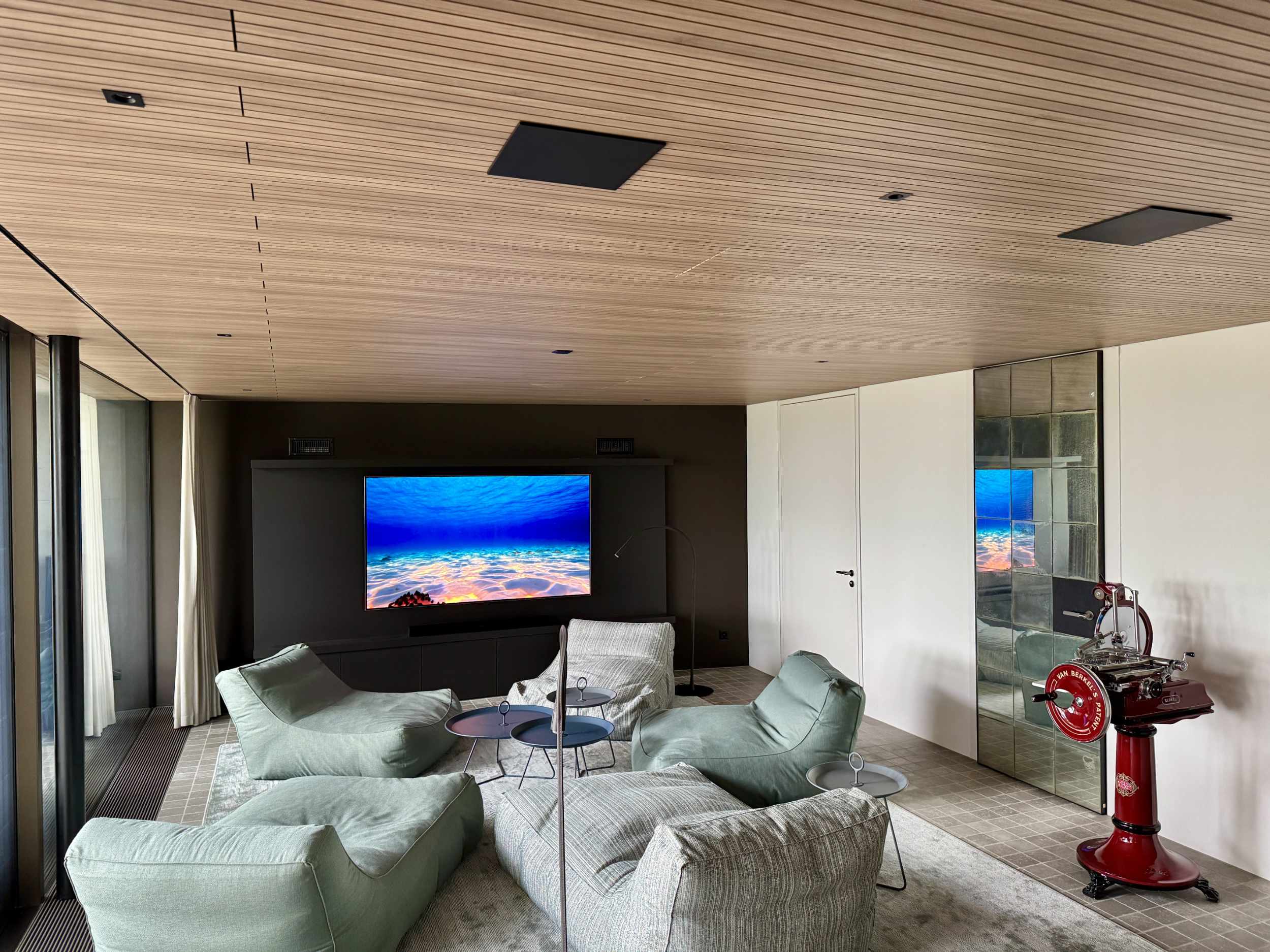 Für einen Neubau durfte ein massgeschneidertes Audio-Video Konzept geplant, begleitet und umgesetzt werden. Mehrere Räume wurden mit schlichten Deckeneinbaulautsprechern der Marke Sonance ausgestattet, welche mittels moderner Verstärkertechnologie optimal auf die unterschiedlich grossen Räume justiert und eingepegelt wurden. Jede Zone kann individuell per App bedient werden. Die Fernsehgeräte wurden passend zur jeweiligen Räumlichkeit und Einrichtung eingeplant und sorgen dank der Integration der Einbaulautsprecher für ein hochwertiges Heimkinoerlebnis. Mittels der programmierbaren Steuerung können die Gerätschaften inkl. Swisscom-TV, Apple TV und Blu-Ray Player bequem per Fernbedienung und App gesteuert werden.