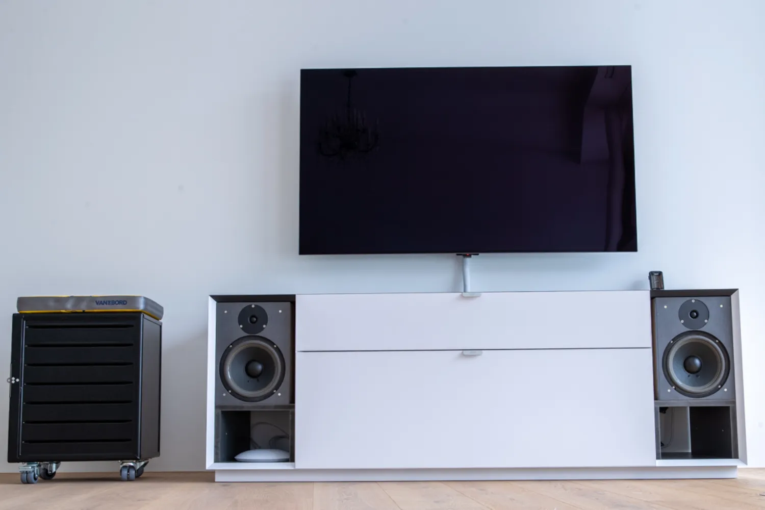 Für einen Wohnungsneubau durfte das Audio- und Videokonzept geplant und umgesetzt werden. Ein Beovision Harmony 77″ mit zwei Beolab 18 Lautsprecher und einem Beolab 19 Subwoofer sorgen im Wohnzimmer für ein atemberaubendes Fernseh- und Musikvergnügen. Bereits bei der Planung wurde gemeinsam die Positionierung der Produkte geplant, damit alle Zusatzgeräte und die Kabel unsichtbar platziert und verlegt werden konnten.