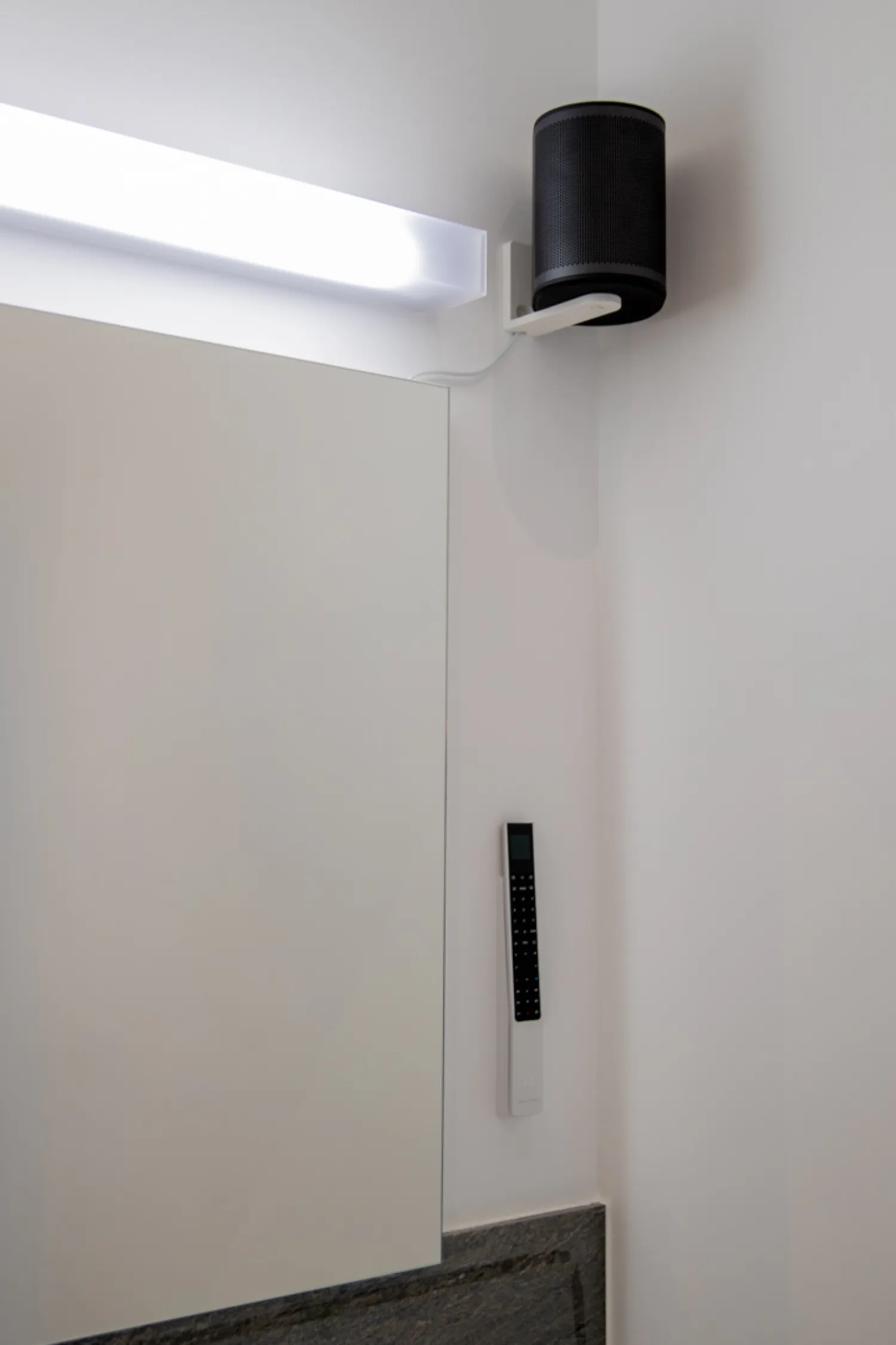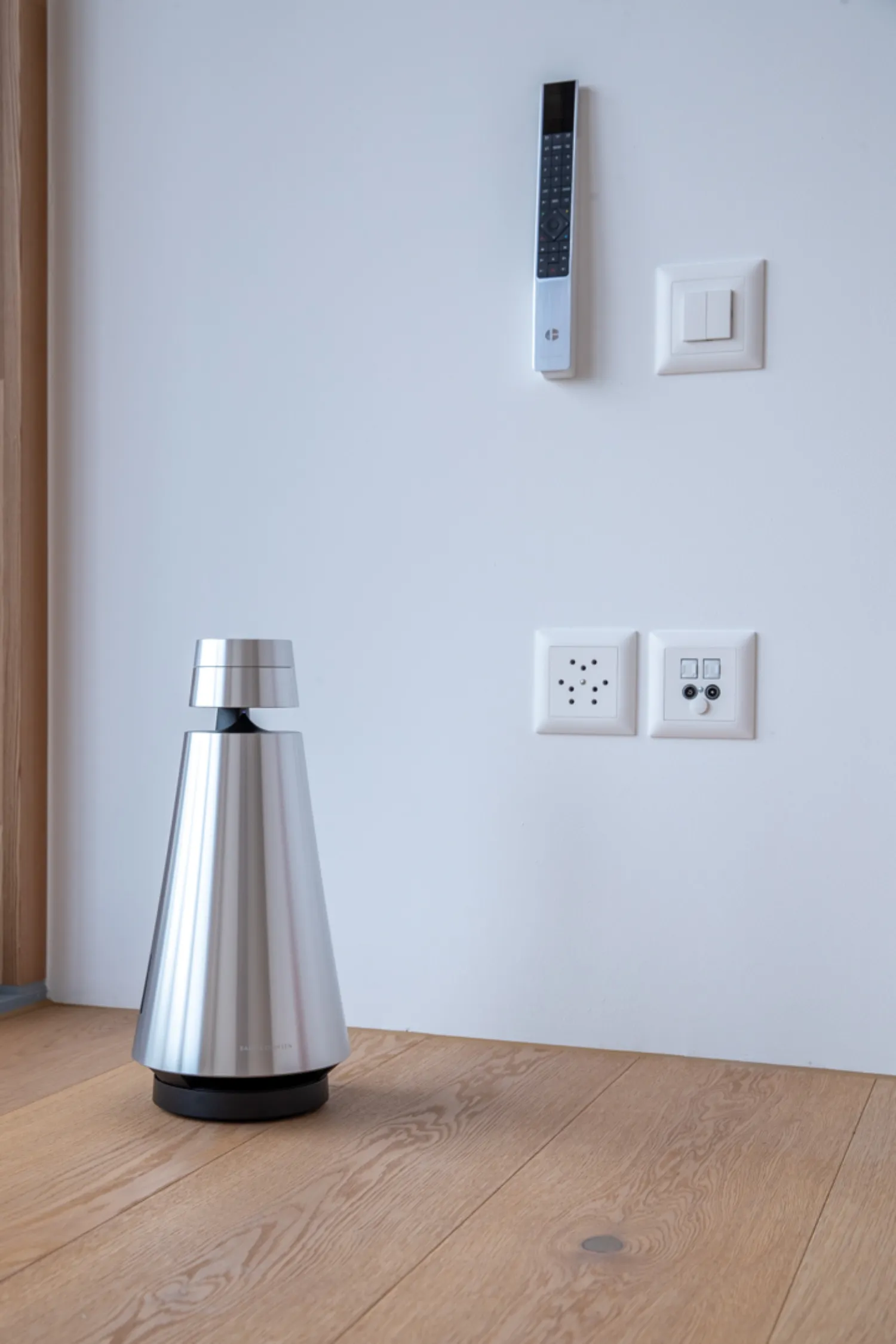 Das Aluminium und Holz der Bang & Olufsen Gerätschaften harmonieren perfekt mit der schönen Sichtbetonwand. Im Essbereich, Schlafzimmer, Badezimmer und den weiteren Räumlichkeiten wurden hochwertige Lautsprecher in die Betondecke eingelassen und in der Sauna wurde ein wasserdichter Lautsprecher installiert. Auf Knopfdruck bei der Wandbedienung oder mittels der Bang & Olufsen App kann jeder Raum komfortabel gestartet werden.