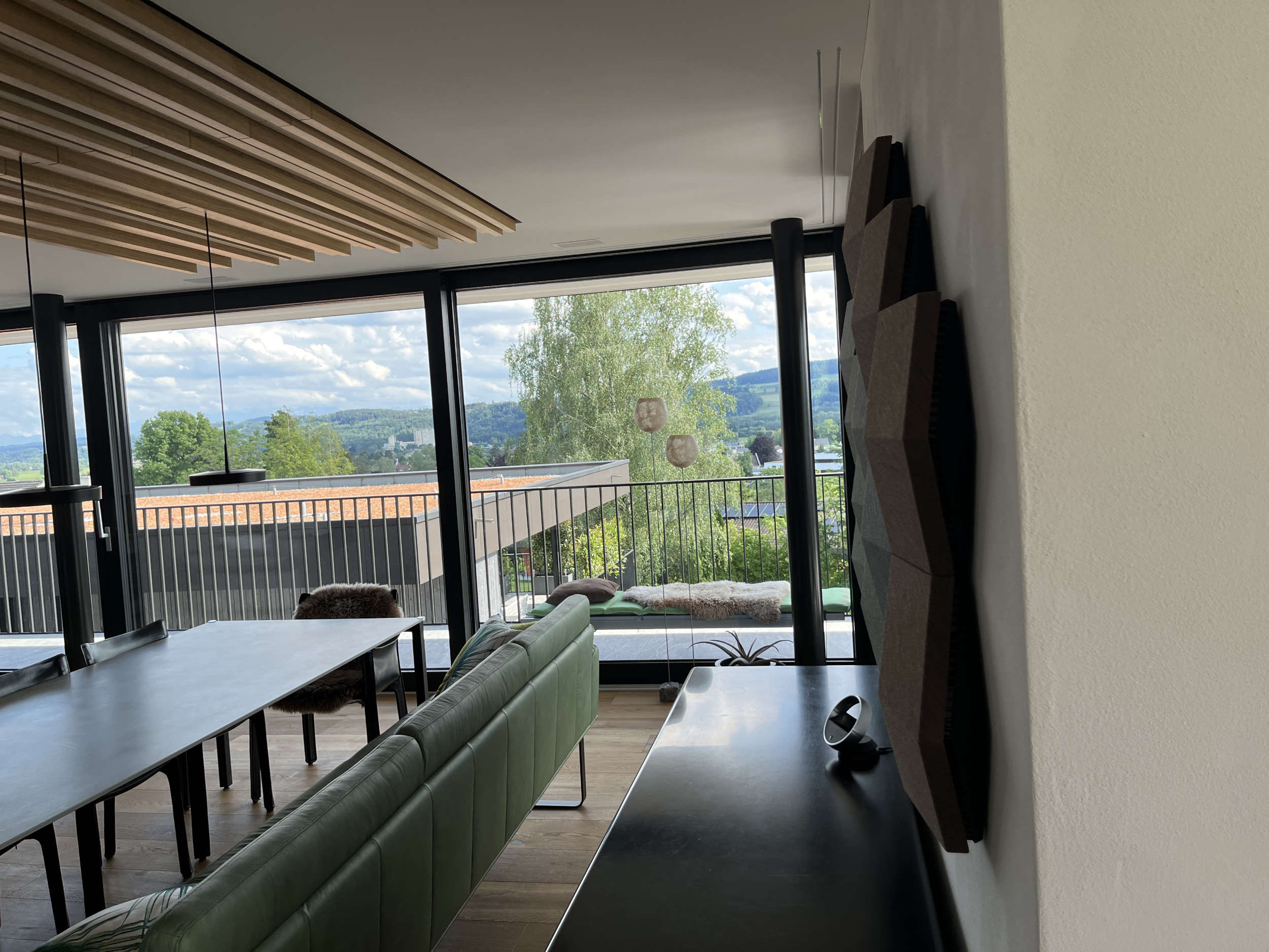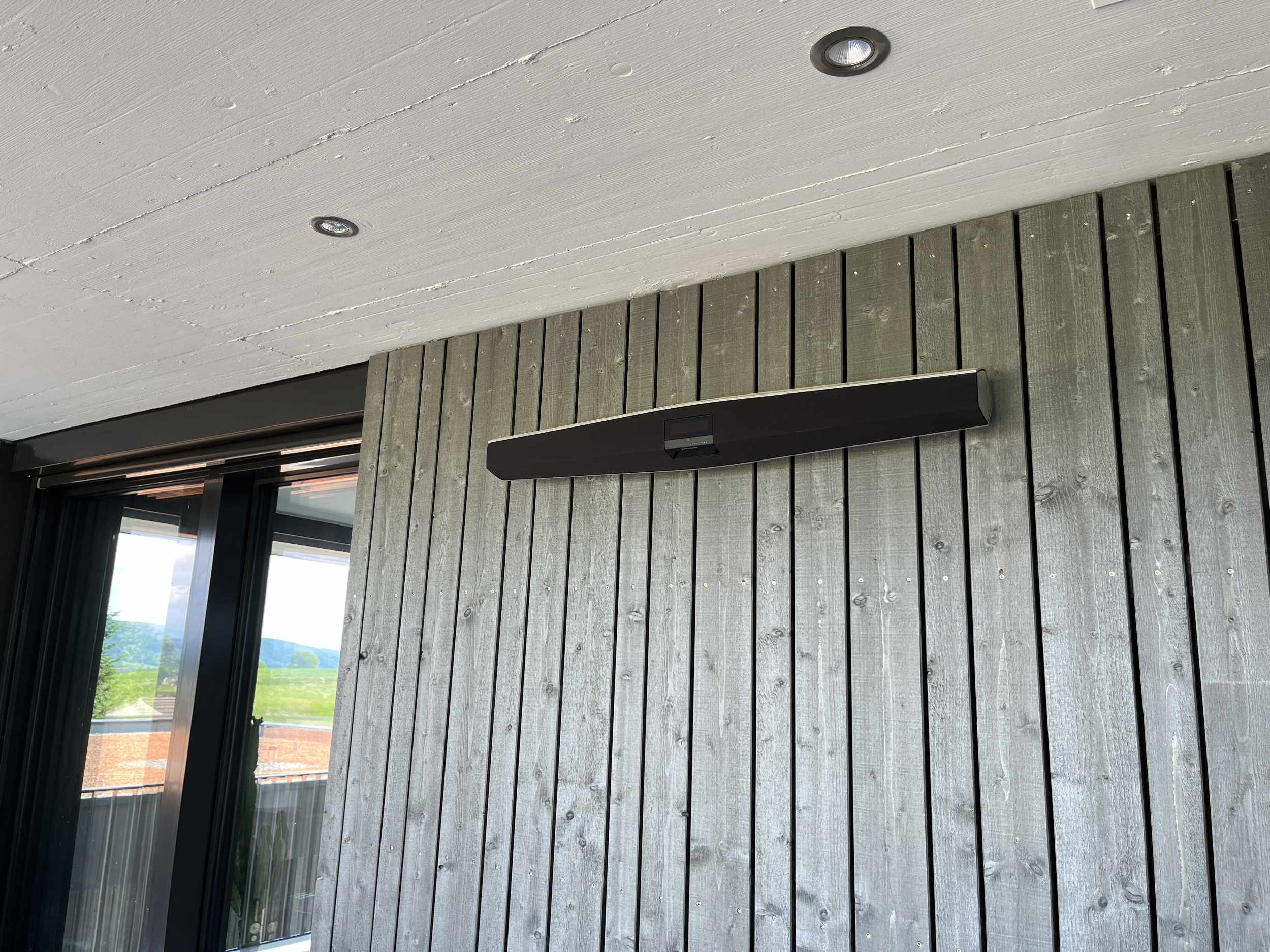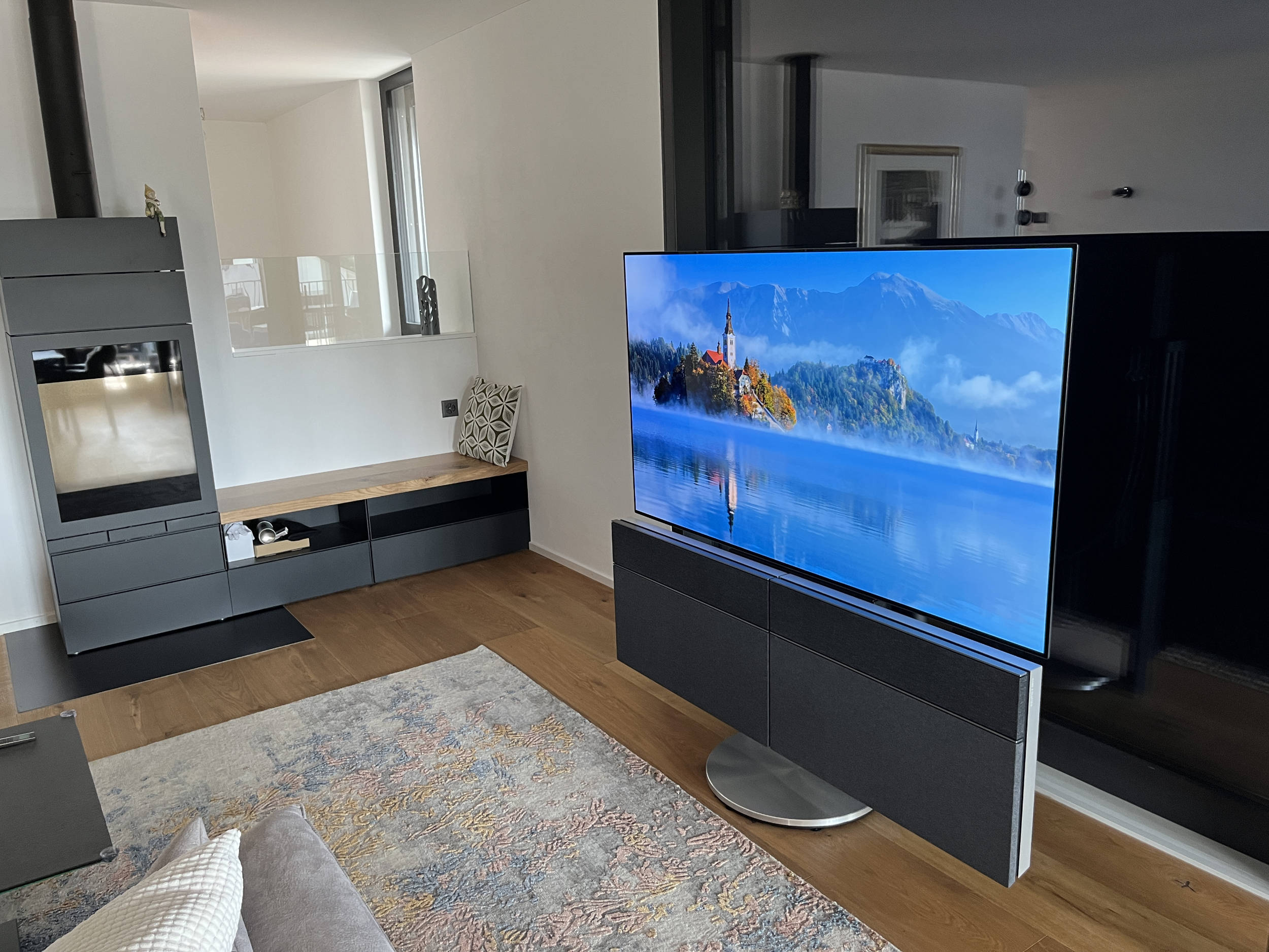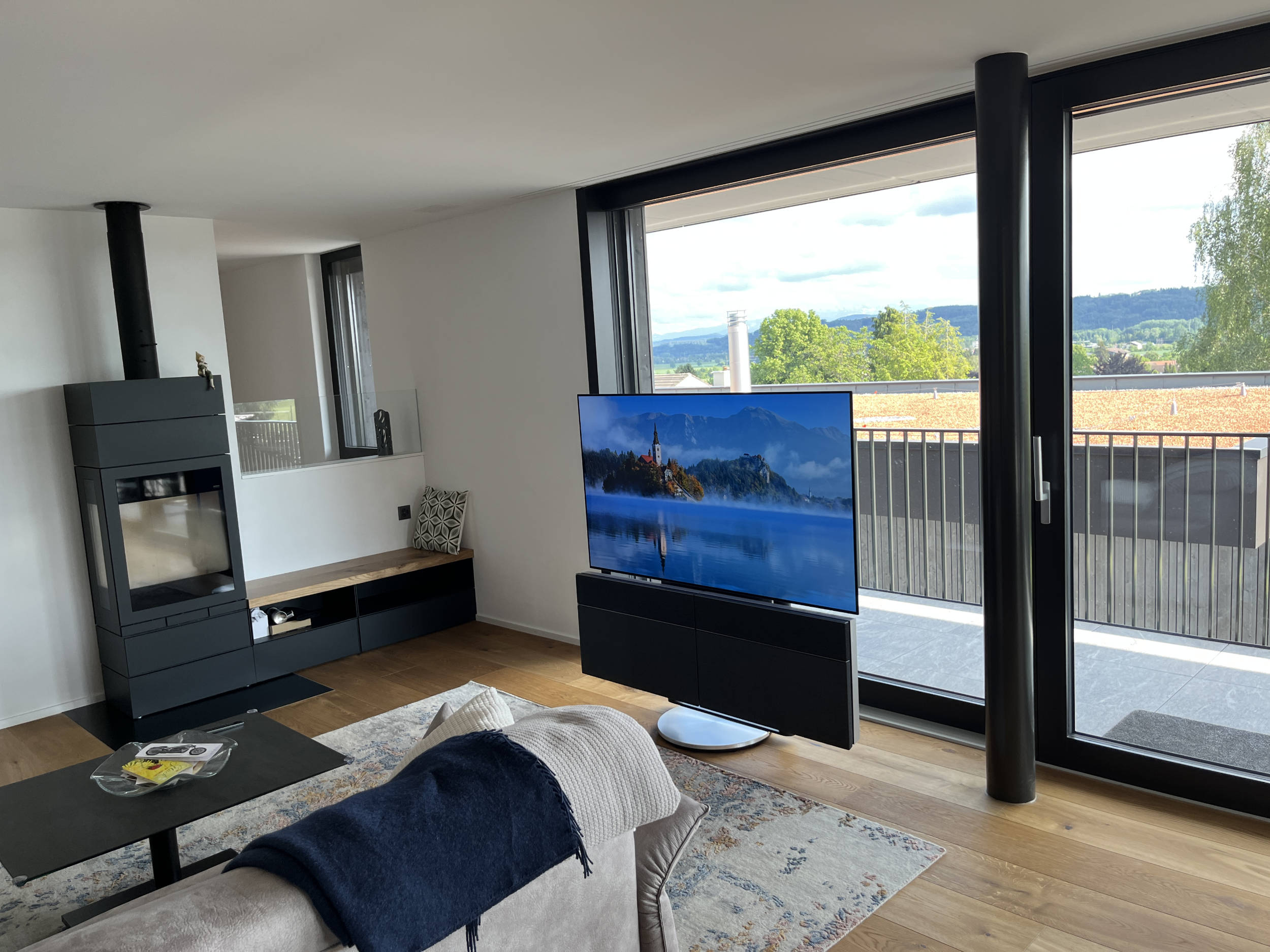 Für einen Wohnungsneubau durfte das gesamte Audio- und Videokonzept geplant und realisiert werden. Ein Beosound Shape an der Wand und der Beovision Harmony 65" mit einem motorisierten Bodenstandfuss sorgen im Wohnzimmer für perfekten Fernseh- und Musikgenuss. In der Küche, auf der Terrasse und im Badezimmer wurden Deckeneinbaulautsprecher installiert und auf der hinteren Terrasse eine Beosound 35. Bedient wird das System über Wandbedienungen oder über die App.