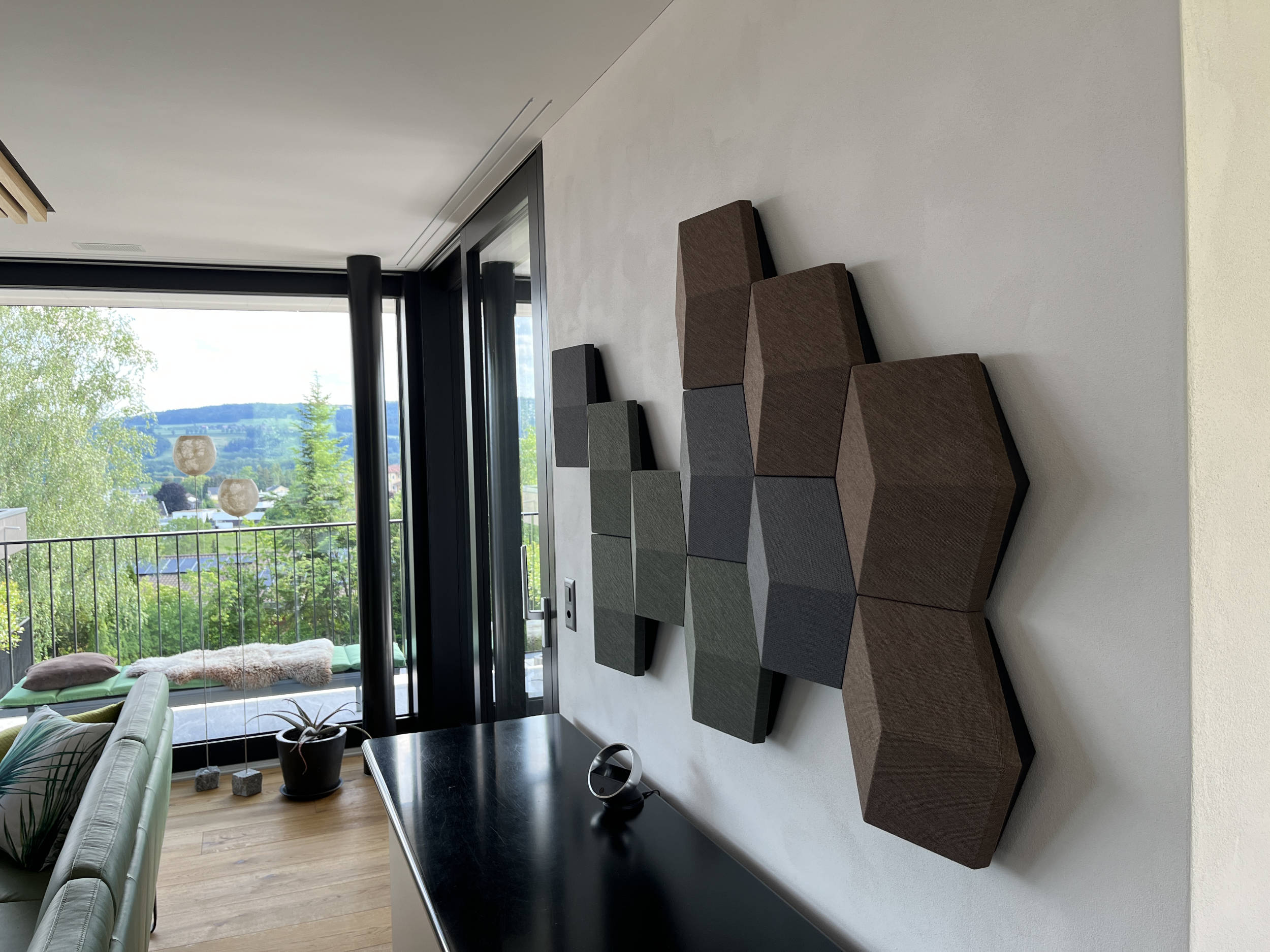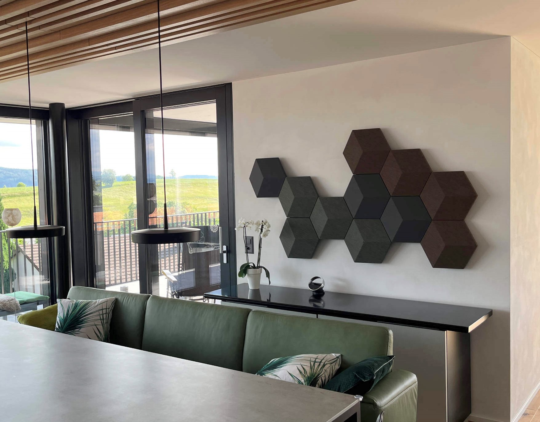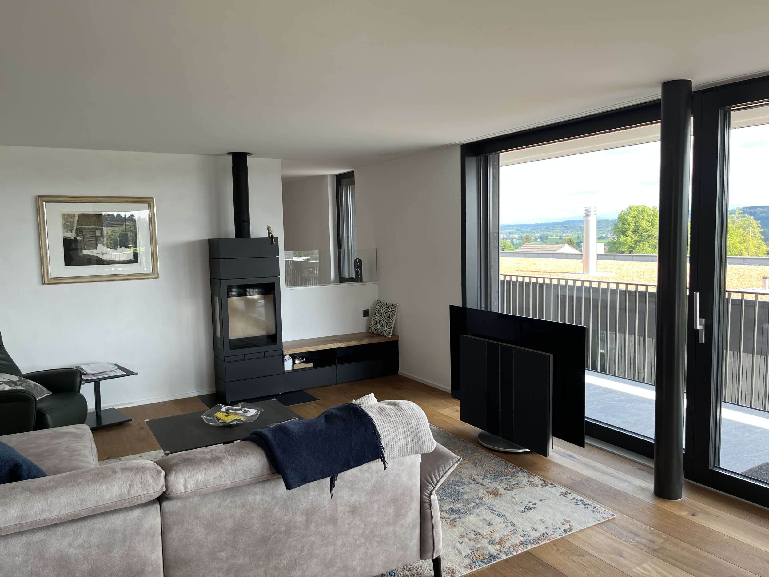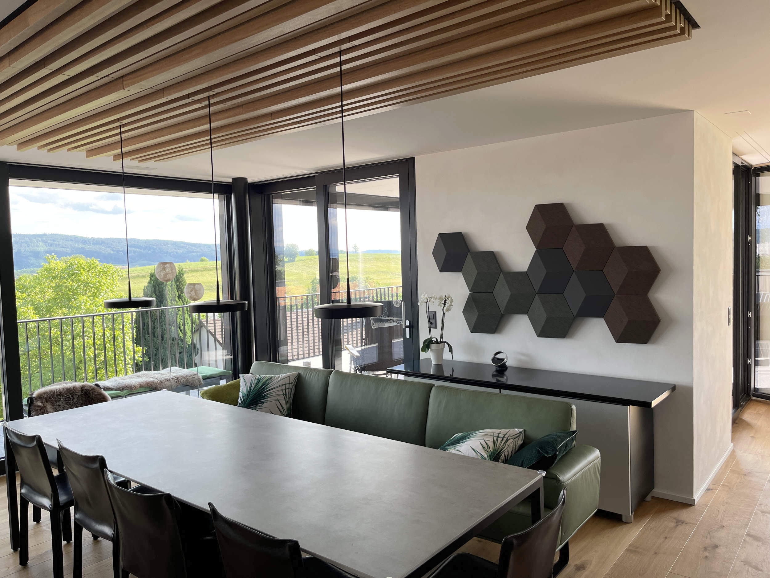 Für einen Wohnungsneubau durfte das gesamte Audio- und Videokonzept geplant und realisiert werden. Ein Beosound Shape an der Wand und der Beovision Harmony 65" mit einem motorisierten Bodenstandfuss sorgen im Wohnzimmer für perfekten Fernseh- und Musikgenuss. In der Küche, auf der Terrasse und im Badezimmer wurden Deckeneinbaulautsprecher installiert und auf der hinteren Terrasse eine Beosound 35. Bedient wird das System über Wandbedienungen oder über die App.