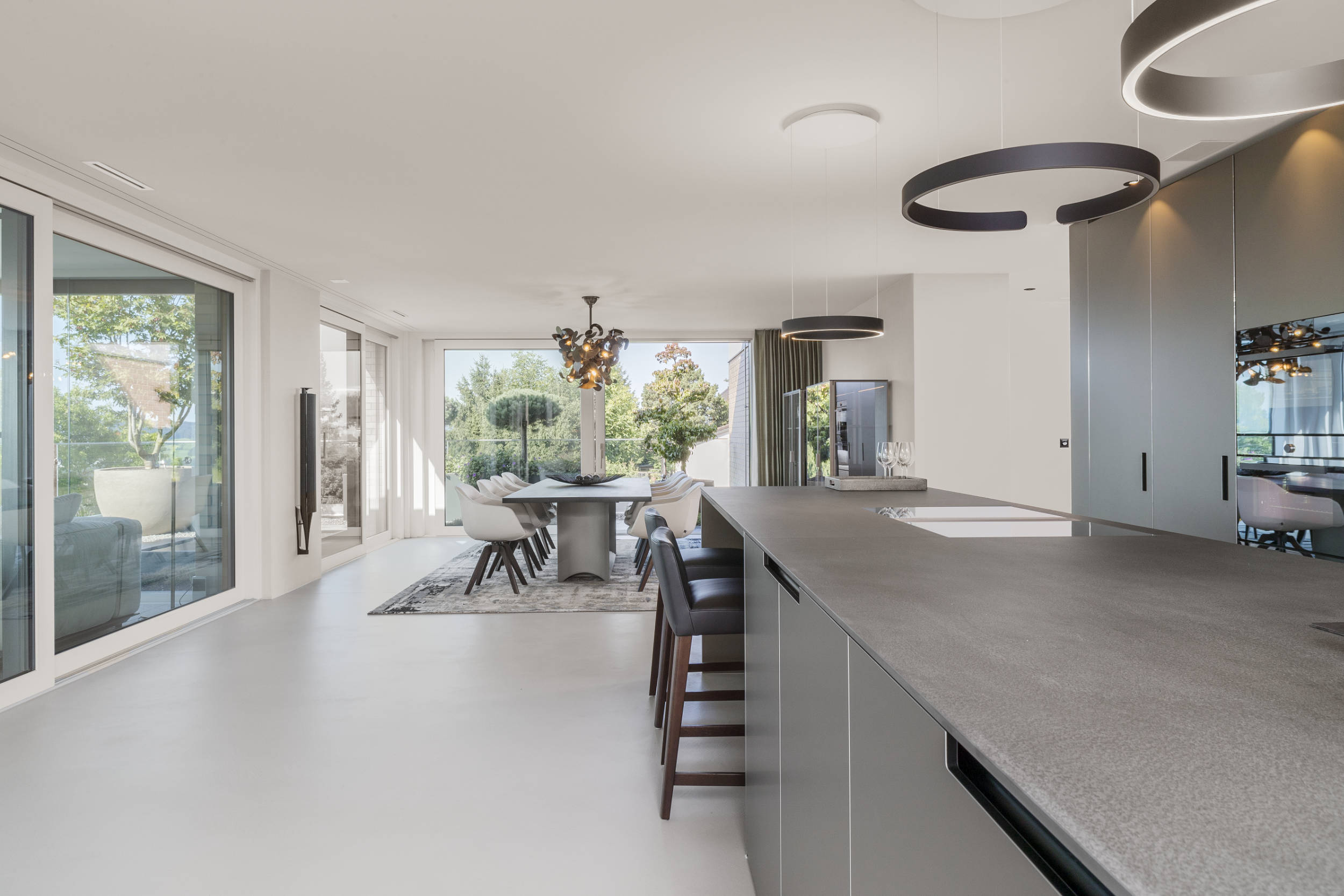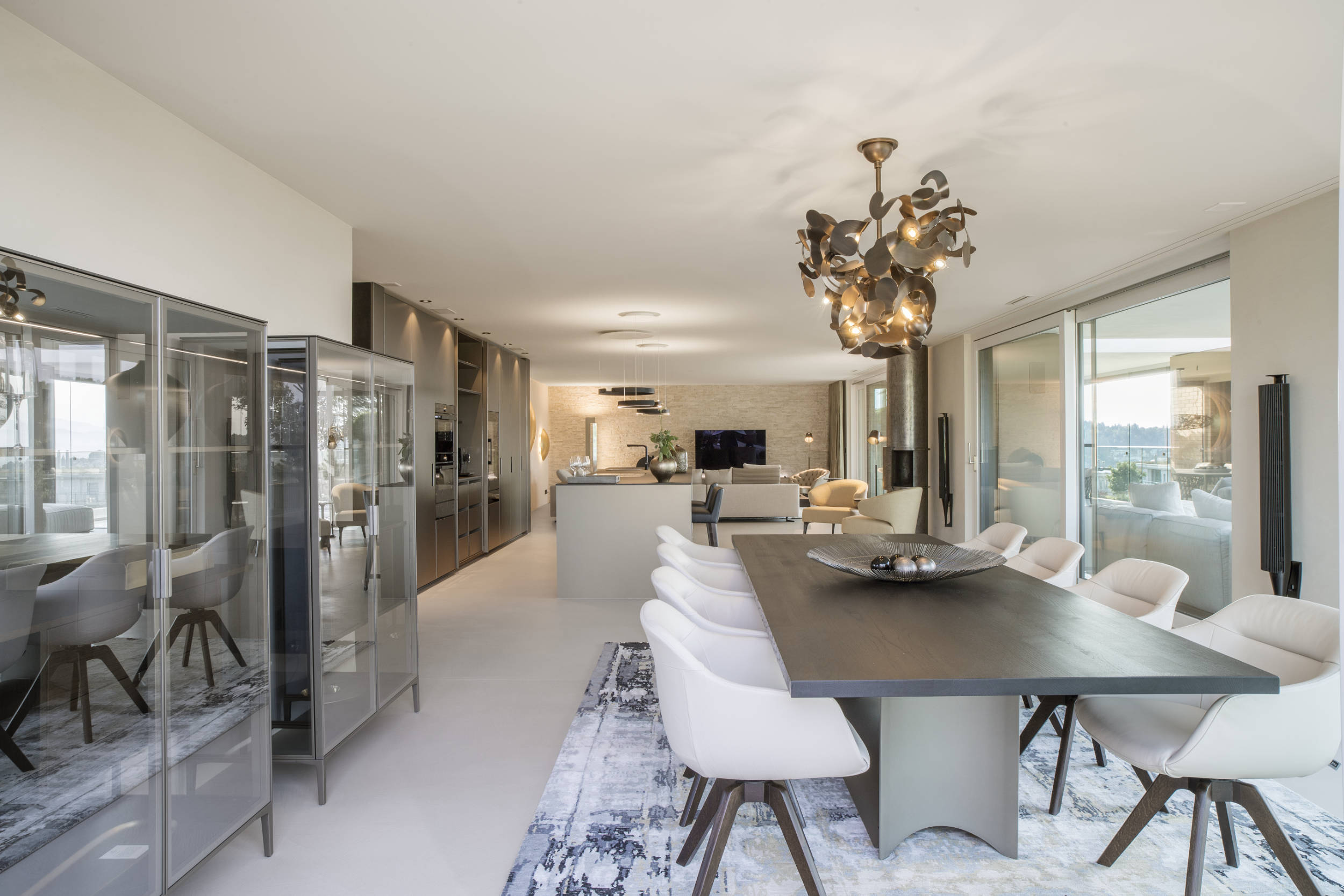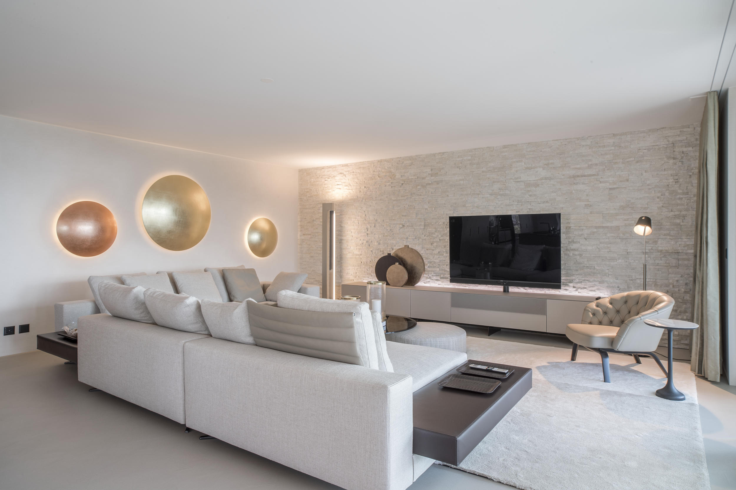 Bei einem Wohnungsumbau durfte das komplette Audio- und Videosystem erneuert und erweitert werden. Als Fernsehlösungen für die unterschiedlichen Zimmer wurde der deutsche Hersteller Metz gewählt. Im Wohn- und Essbereich sorgen die zwei Beolab 18 Lautsprecher von Bang & Olufsen für einen erstklassigen Musikgenuss. Auf der Terrasse, in der Bibliothek und in den Nasszellen wird auf Knopfdruck die Musik abgespielt. Im Badezimmer und Gäste-WC wurden unsichtbare Unterputz-Lautsprecher eingebaut. Wird das Licht im Gäste-WC eingeschaltet, erklingt automatisch Hintergrundmusik.